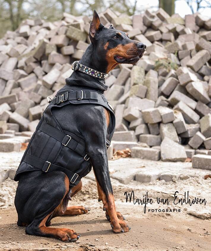 Een K9 tuig met dubbele buikbanden en geen handvat maar 2 stevige ringen op de rug en 1 ring aan de voorkant.Ook met 4 cobra gespen